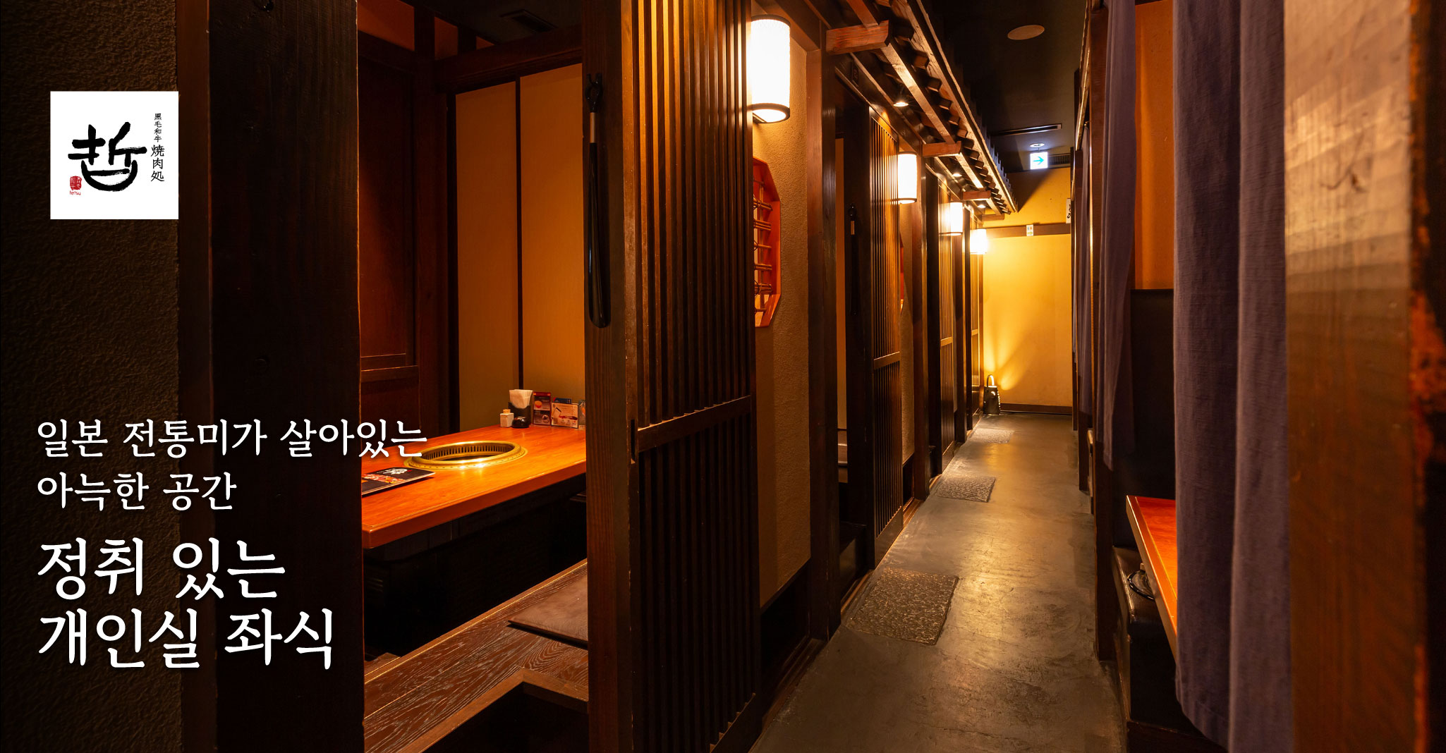 차분한 분위기 속에서도 아담하고 따뜻한 느낌의 공간. 고급 점처럼 딱딱하지 않고, 마음 맞는 친구나 소중한 분과 함께 부담 없이 야키니쿠를 즐기실 수 있습니다.